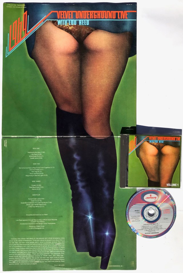 (Here) is a double album of the Velvet Underground recorded live in 1969, but only released in 1974 to cash in on Lou Reed’s solo success. I’ve always seen this artwork as a nod towards Reed’s seedy world, both the early ‘Venus in Furs’ S&M and the later songs of hookers, chancers and addicts epitomised by ‘Walk on the wild side’.