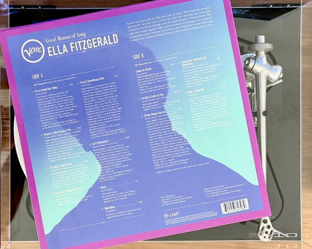 Verve’s aptly titled “Great Women Of Song” series is a welcoming way to enter the world where jazz meets (mid-20th century) pop, and more. The Ella Fitzgerald title we are featuring today is a superb primer, revealing both the genre and Ella’s artistry. “Dream A Little Dream Of Me”, for example, opens with a brief scat by Fitzgerald before Louis Armstrong’s trumpet enters. Louis takes a verse too, with Ella gently improvising behind him. Ella’s scatting prowess, by the way, is brilliantly demonstrated on “Blue Skies” (Berlin), which closes out side one of the LP.