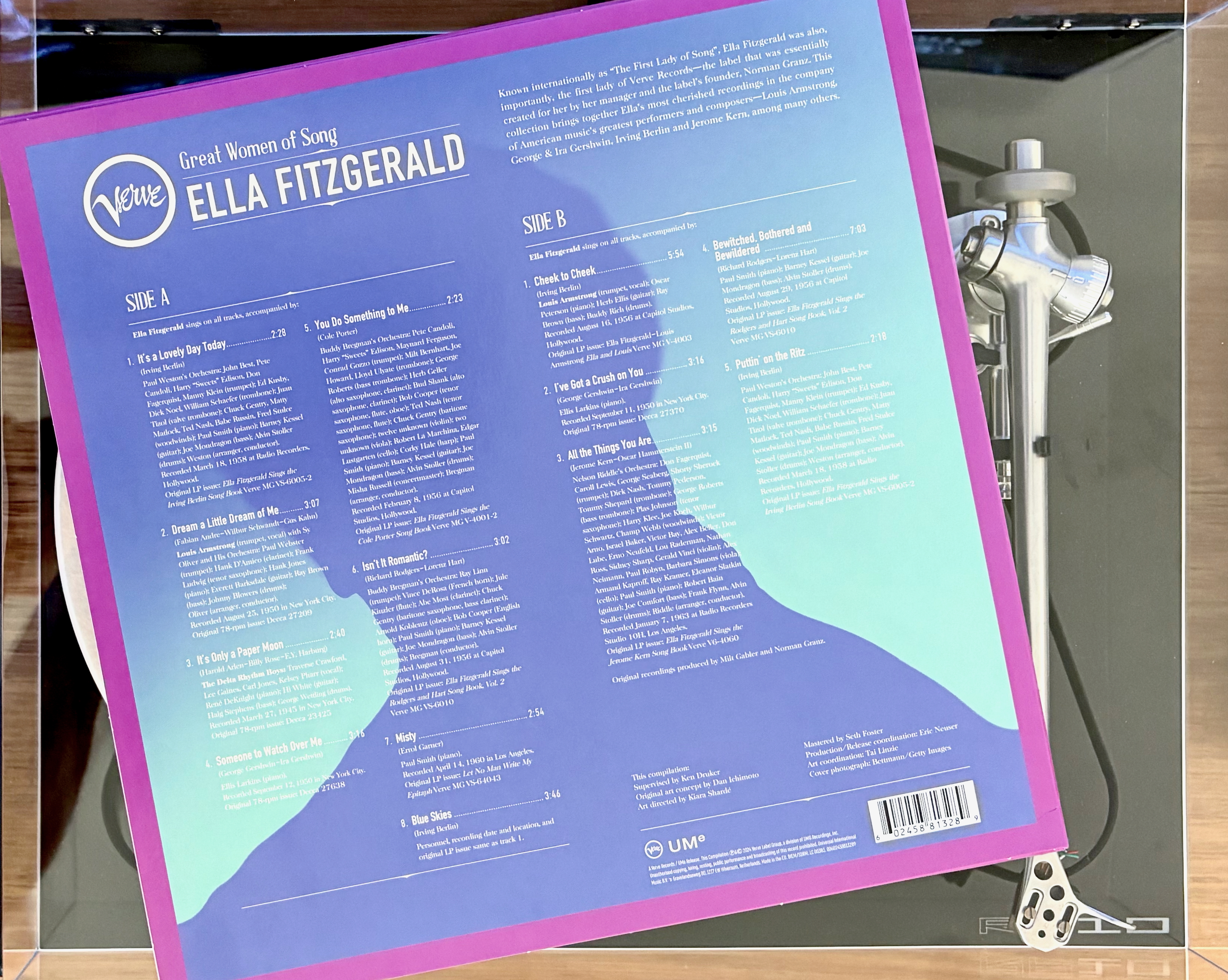 My memory told me that this was done because a miserably small band toured with Ella in the UK in the sixties. A quick check made me wonder if I inferred something from a discussion that I heard about the producer’s motivation for doing this. I may have inferred that the inadequate sixties band was replaced by the LSO rather than them using voice recordings from studio recordings. Doesn’t matter! It’s another good Ella album.